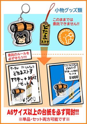アクリルキーホルダーや缶バッジなど小物のグッズ類を単品で委託されたい場合は、必ずA6サイズ以上の台紙を入れてください。
